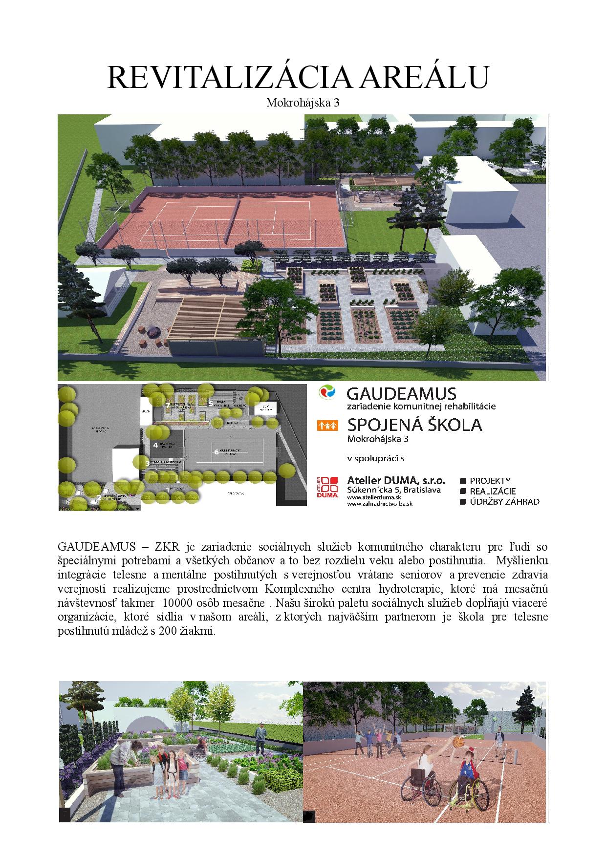 Našim cieľom pre rok 2016 je získať finančné prostriedky na realizáciu návrhu revitalizácie exteriéru nášho zariadenia. V súčasnosti areál využívajú pre svoje aktivity naši klienti a žiaci a študenti Spojenej školy Mokrohájska 3.